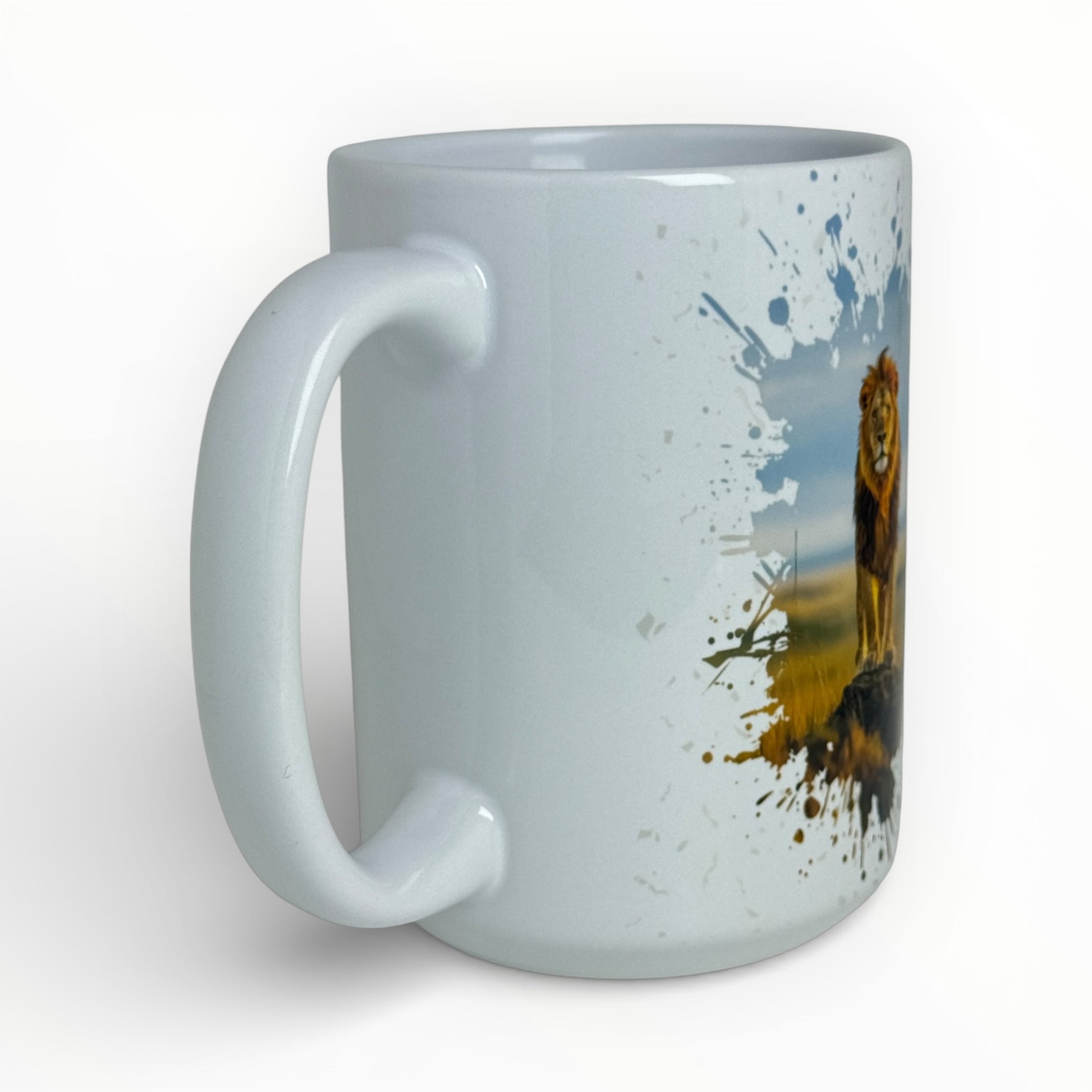 Channel your inner strength every morning. This 440ml ceramic mug features a commanding lion rendered in rich golden tones against dramatic ink splashes of blue and charcoal. The powerful message—"Dominate Your Day: Fierce & Focused"—serves as your daily call to action, reminding you to approach each day with the strength and determination of the king of the jungle.