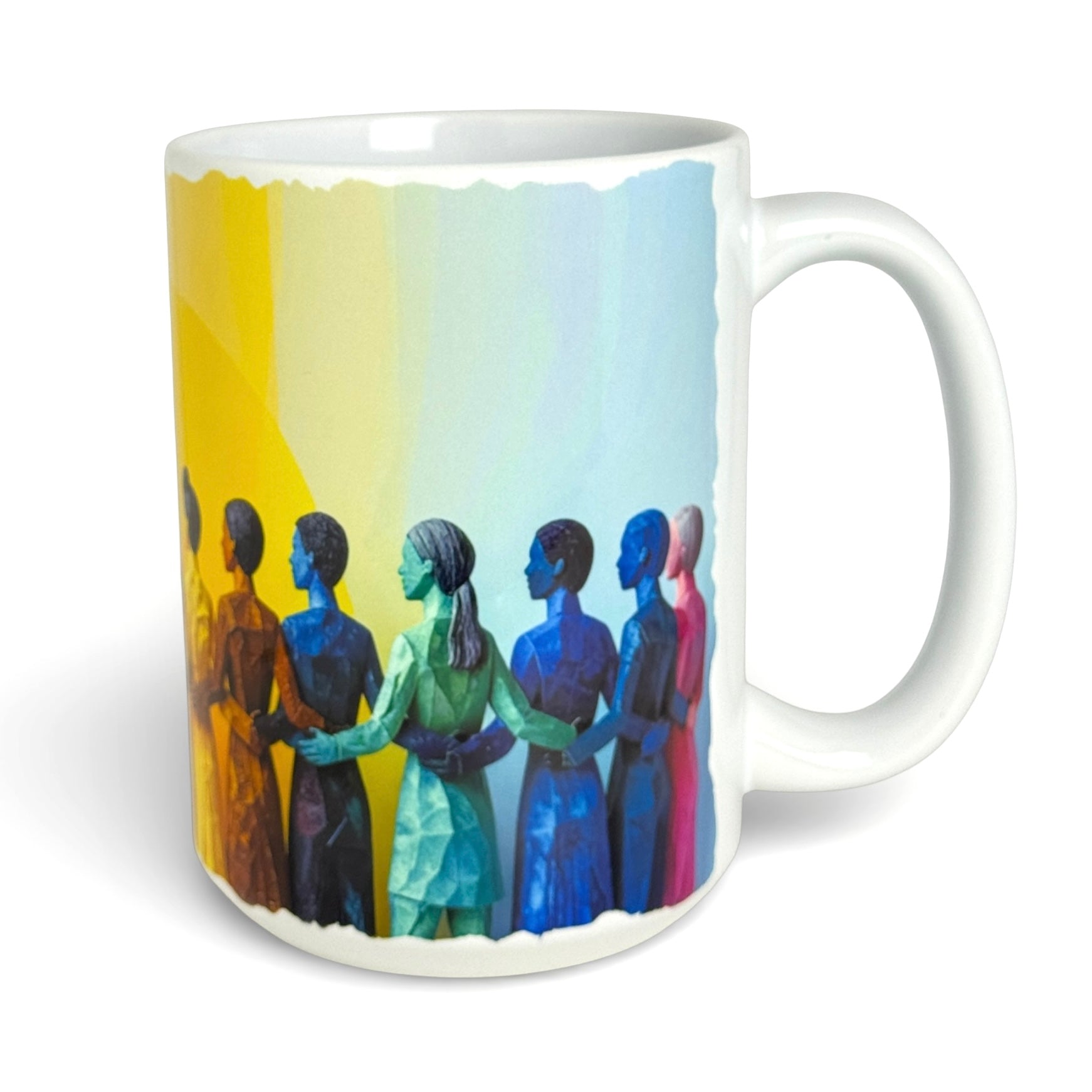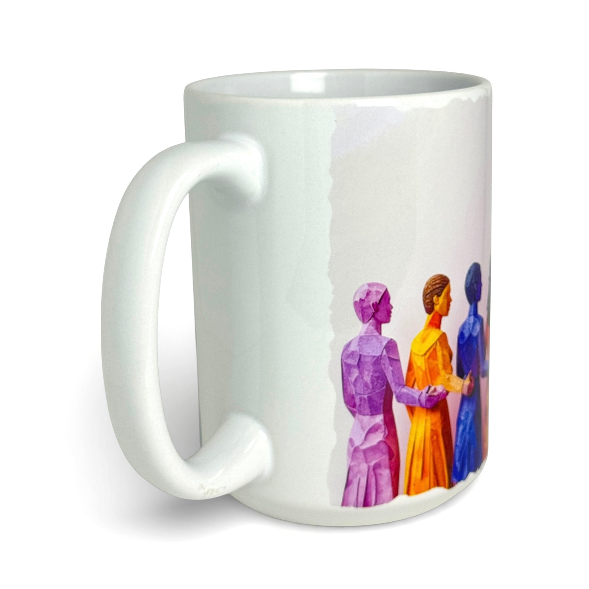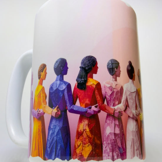 Celebrate the strength found in unity and diversity. This 440ml ceramic mug features a powerful artistic representation of women standing together, hand in hand, rendered in vibrant watercolor tones that flow across a soft gradient background. Each figure is uniquely colored—from warm golds and oranges to cool blues, purples, and pinks—creating a stunning visual celebration of diversity, solidarity, and collective strength.