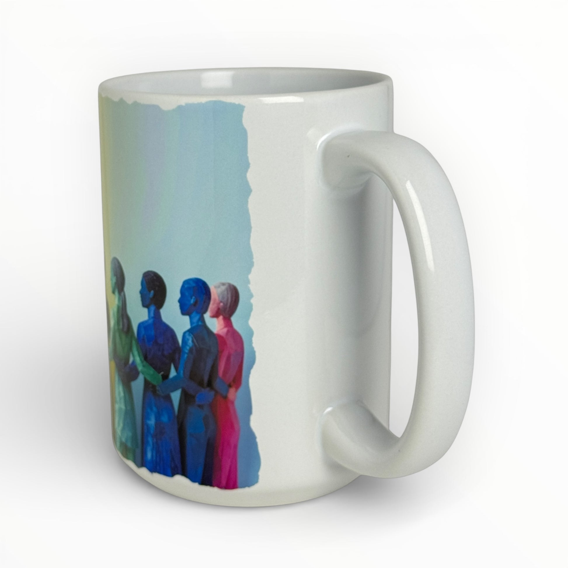 The watercolor technique gives each silhouette a luminous, almost ethereal quality, while the rainbow of colors symbolizes the beauty of our differences coming together. As the design wraps around the mug, it creates a continuous circle of unity, making each sip a reminder of the power we hold when we stand together.